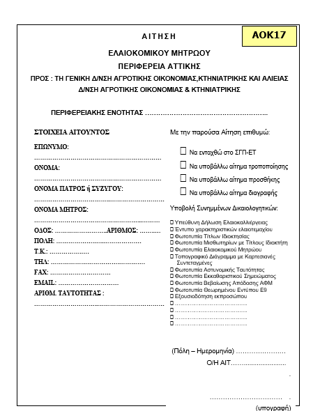 Κατόπιν των ανωτέρω, παρακαλούνται οι ελαιοκαλλιεργητές της χωρικής αρμοδιότητας της ΔΑΟΚ ΠΕ ΔΥΤΙΚΗΣ ΑΤΤΙΚΗΣ να ελέγξουν τα δεδομένα που υπάρχουν ή δεν υπάρχουν στο Ελαιοκομικό Μητρώο συνδεδεμένα με τον ΑΦΜ τους, αποστέλλοντας σχετική αίτηση (Υπόδειγμα Αίτηση 1) στα email: agroktin.peda@patt.gov.gr, xdouroukos@patt.gov.gr με θεώρηση του γνησίου της υπογραφής του αιτούντος/σας από αρμόδια αρχή (π.χ. διοικητικές αρχές, ΚΕΠ, πρεσβεία, προξενείο κ.λπ.) ή με Ψηφιακή υπογραφή ή με Ψηφιακή βεβαίωση εγγράφου μέσα από το gov.gr.