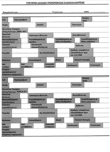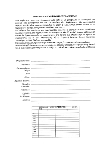 -Διαφωνία με τα στοιχεία που αναγράφονται στο εκτυπωμένο ελαιοκομικό αλφαριθμητικά και χαρτογραφικά (σε αριθμό δέντρων, θέση, όρια, εμβαδόν κλπ)
